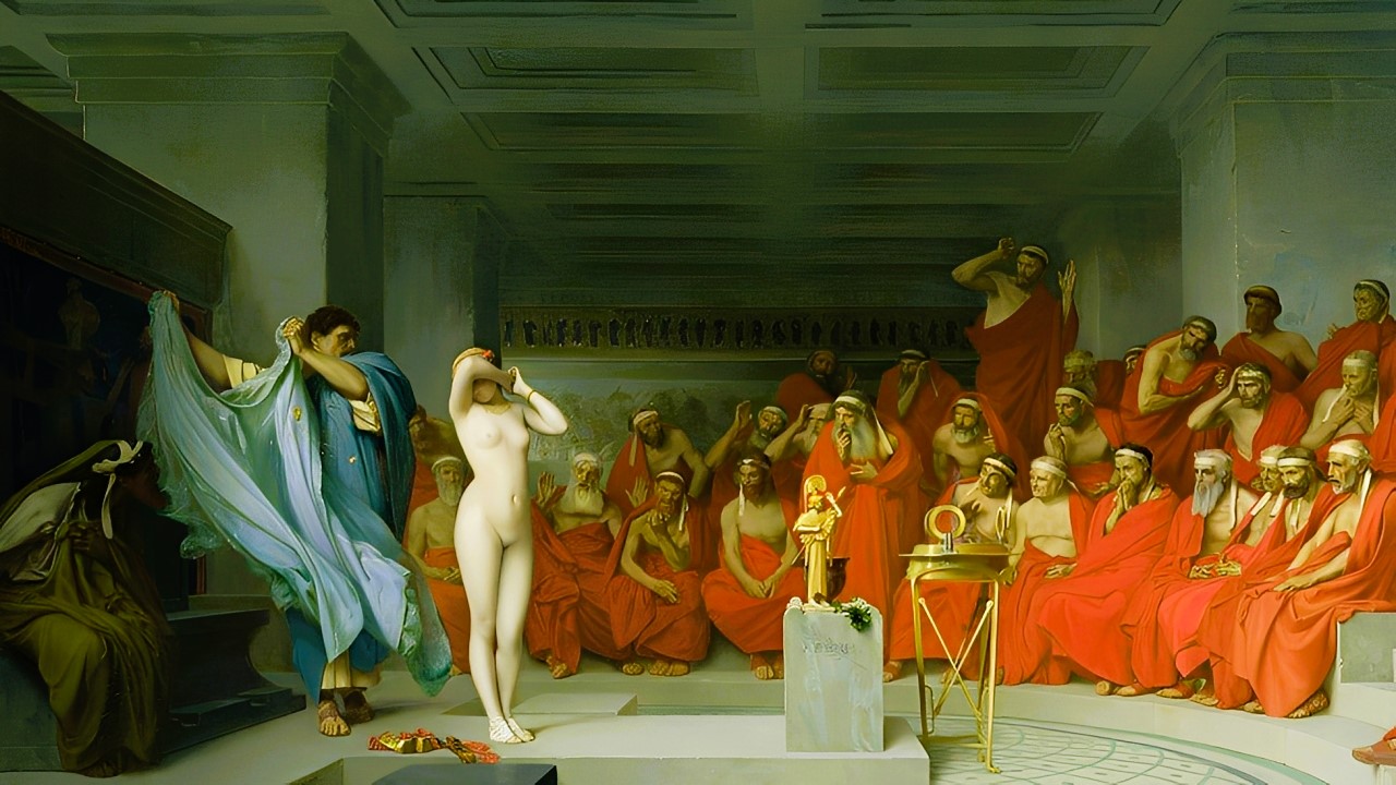 O trajeto até a Ágora fora um suplício. A carruagem aberta, puxada por dois cavalos brancos, parecia cortar o silêncio da cidade com o ranger das rodas. Frinéia, escondida por um véu de seda fina, observava os rostos que se voltavam para ela. Alguns expressavam curiosidade, outros desprezo, mas a maioria transbordava um misto de fascinação e condenação.
