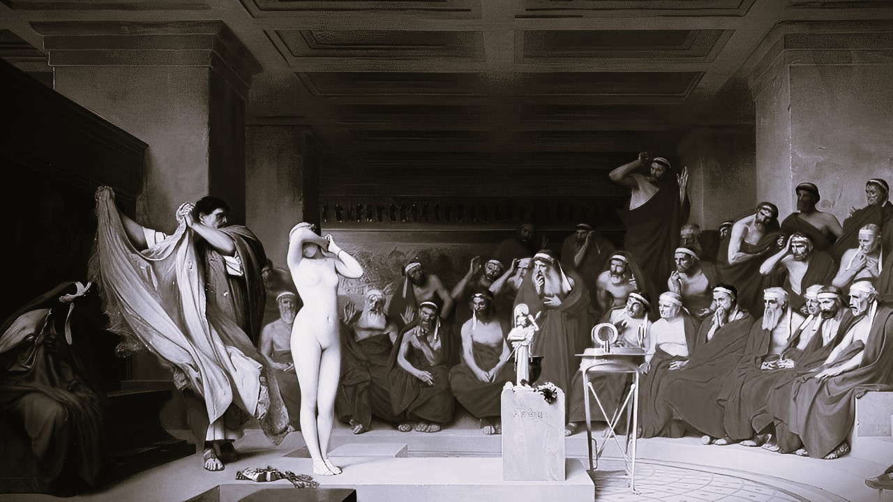 Ali estava Frinéia, nua, de pé perante seus juízes, em todo o seu magnífico esplendor, banhada pela luz filtrada pelas aberturas do tribunal, resplandecente como a própria estátua que inspirara. Seu corpo, a perfeita encarnação da forma e da simetria, era a prova irrefutável oferecida pela defesa. A verdade nua e crua em toda a sua beleza. O silêncio que se seguiu não era mais de condenação, mas de reverência. Os juízes já não viam a cortesã acusada, mas contemplavam a divindade que nela habitava. Sua nudez era a epifania da beleza, a confirmação de que os deuses haviam criado a sua forma com raríssimo esmero.